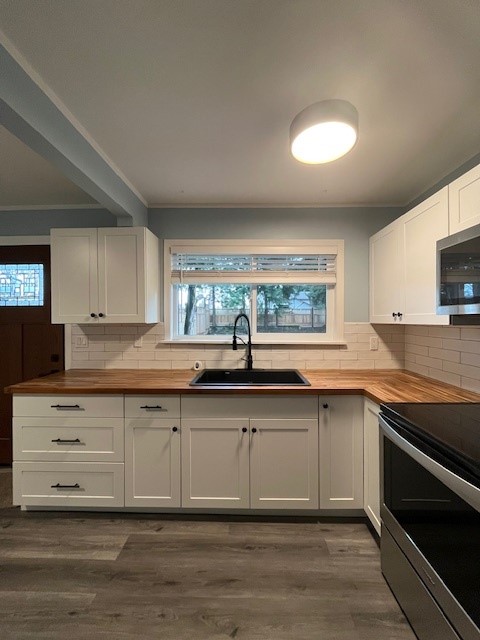 Fully updated kitchen with new countertops, stylish black sink and matching black faucet