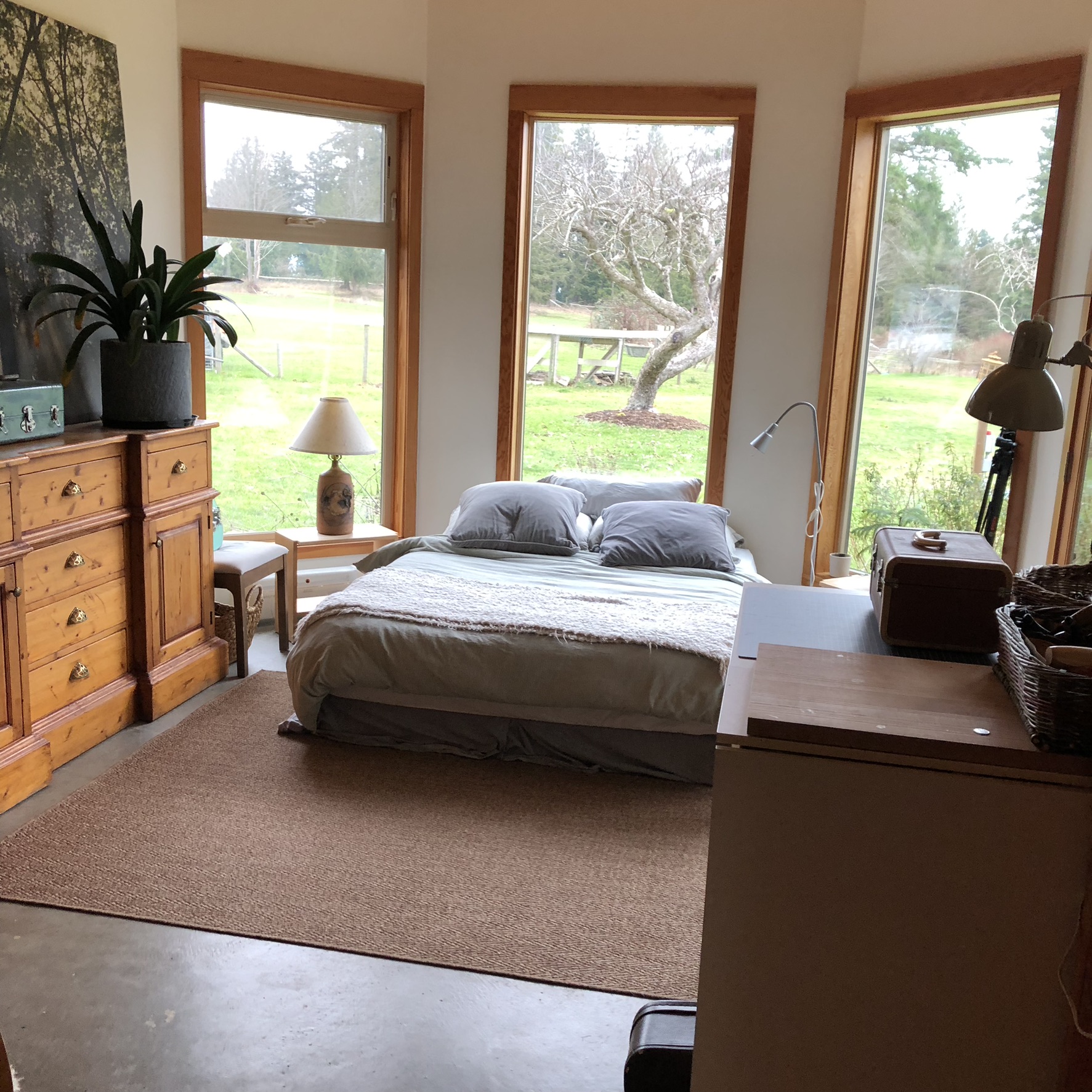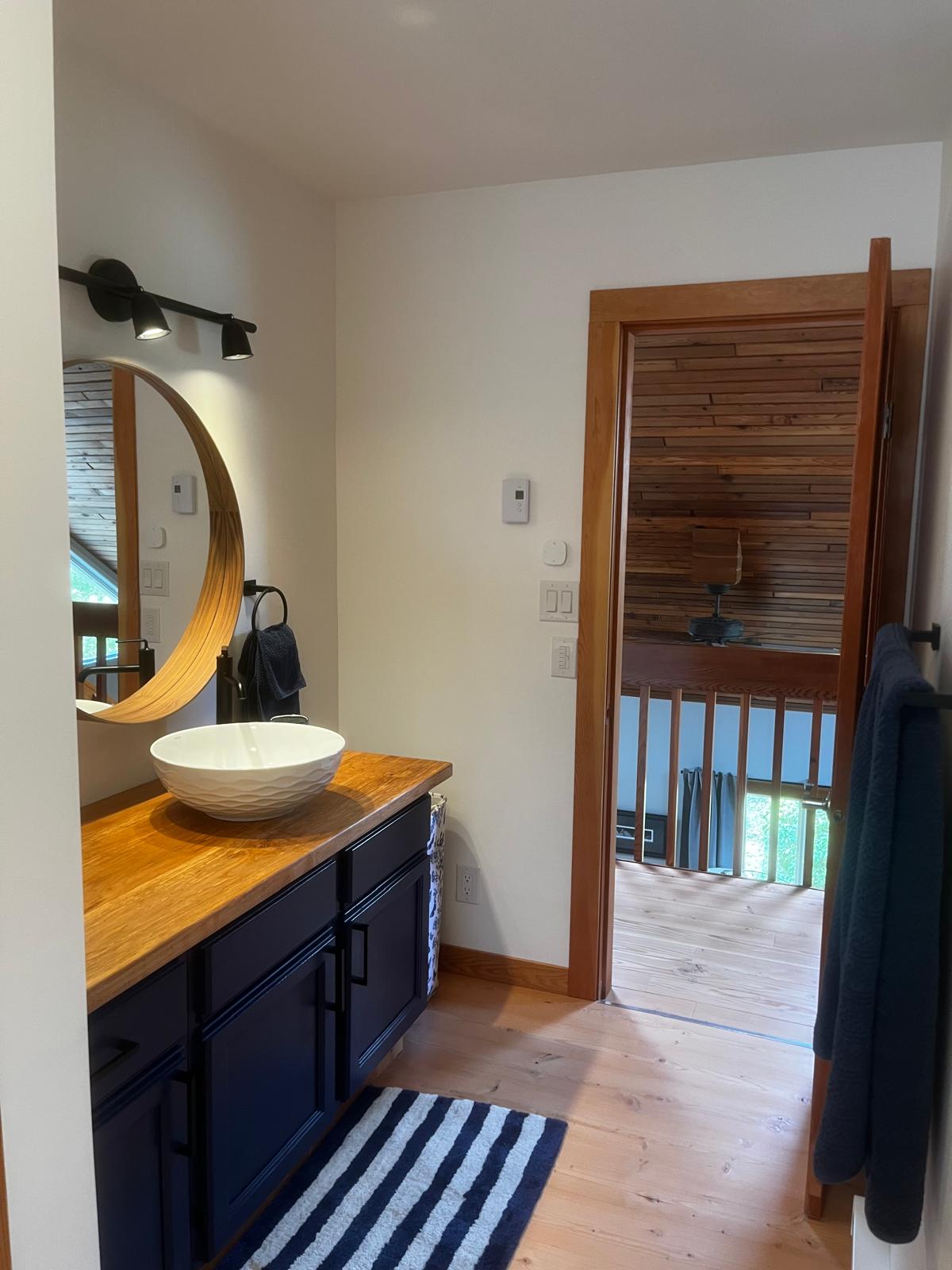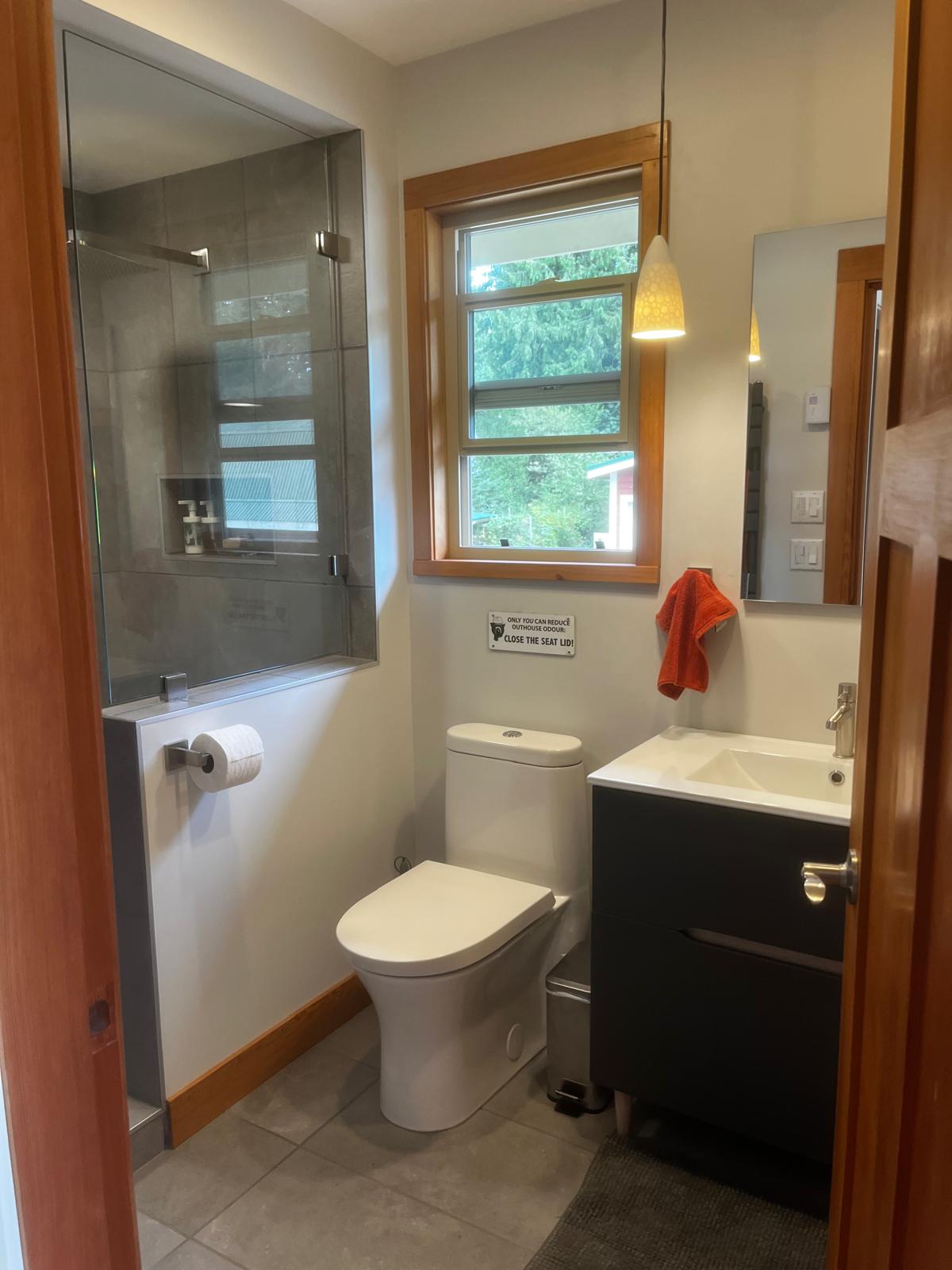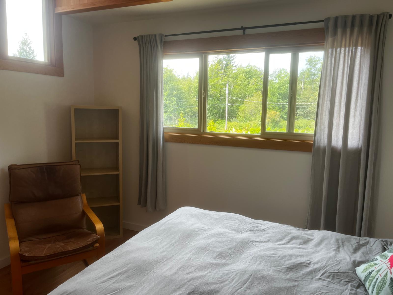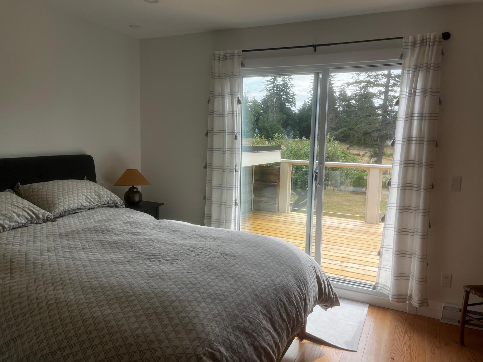 There are two bedrooms on the first floor of the house, both with a Queen-size bed. The larger of the two has a bay window, a sitting area with a couch and TV, and its own patio. The other 2 bedrooms are on the second floor, along an office area nook, a 3-piece bathroom (with a tub) and an ensuite with a walk-in shower in the master bedroom. Enjoy the morning sunrise from the large porch off the master bedroom. All linens are included.