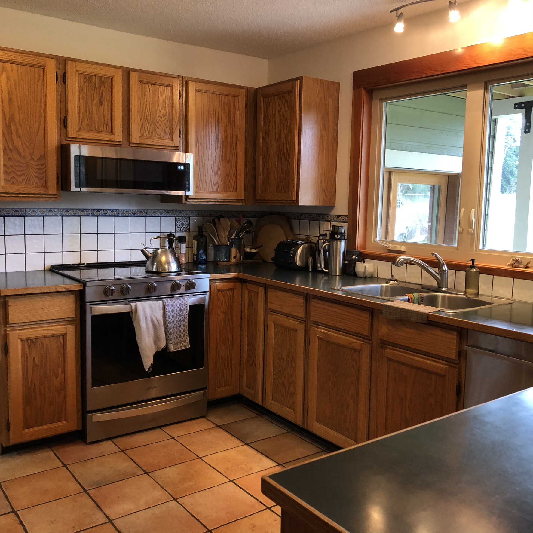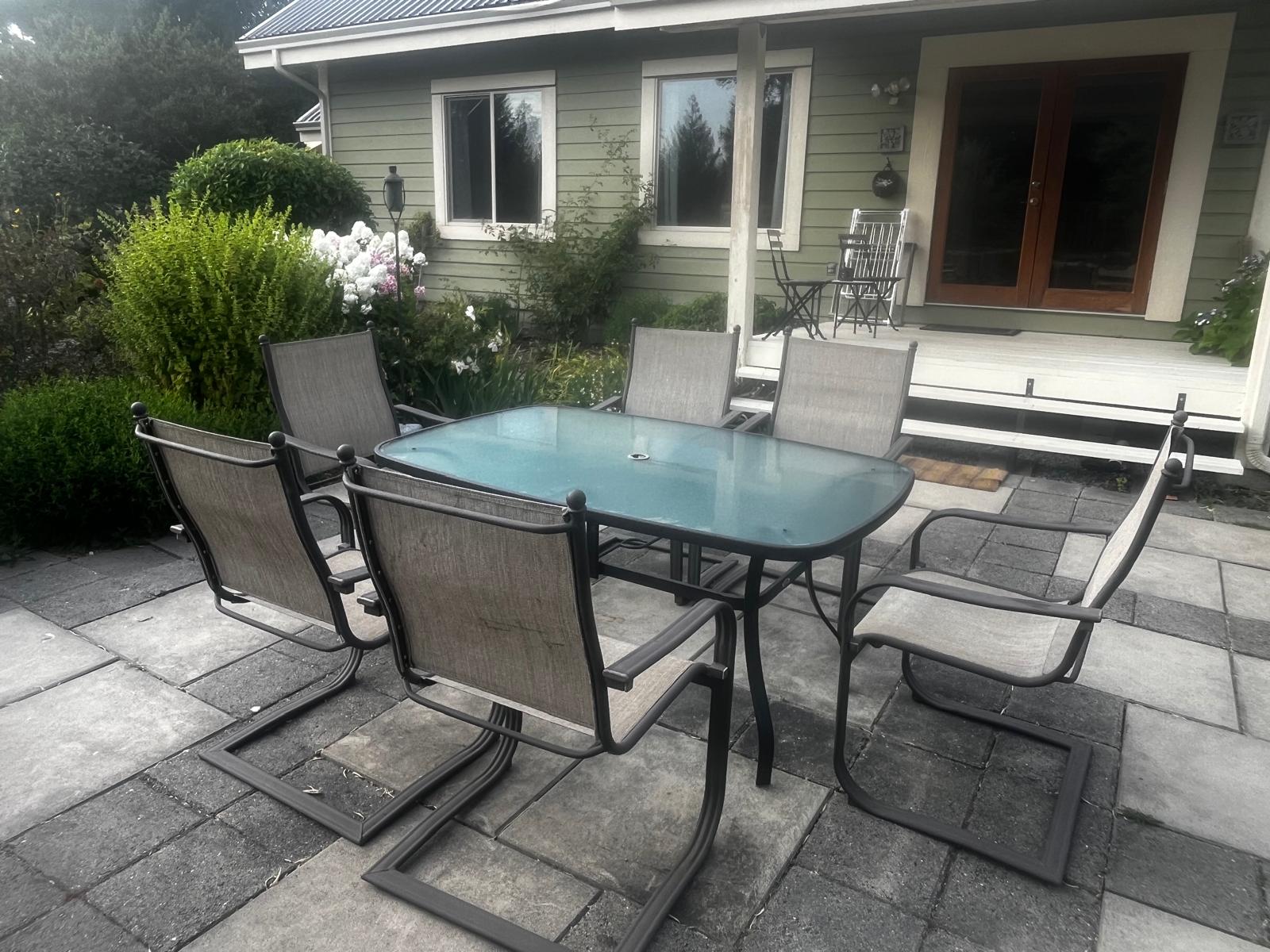 Fully equipped kitchen with stainless steel appliances, cookware, and dinnerware. The glass doors off the dining room give access to the outdoor patio, which includes a complete patio set. The Maytag front-loading washer and dryer are in the back entrance’s mud room.