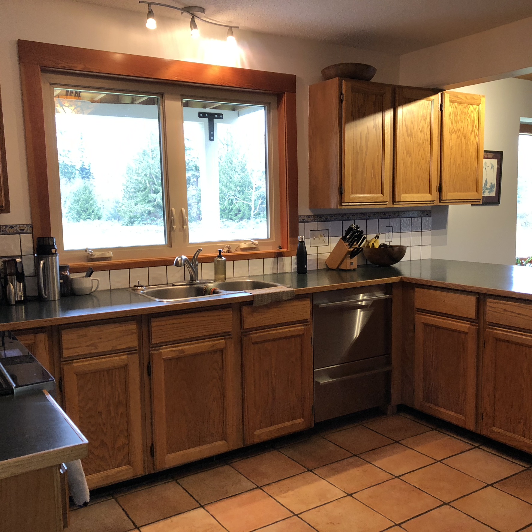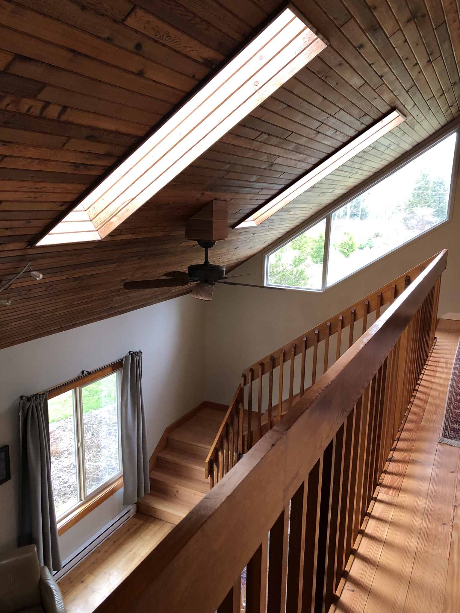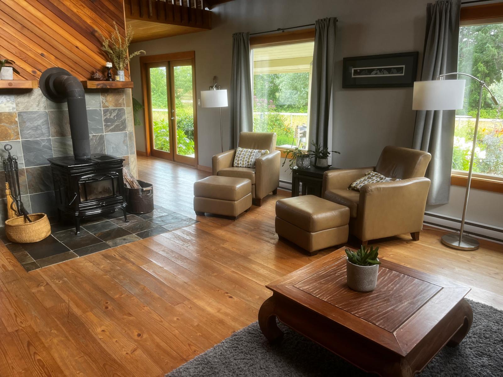 Large windows, vaulted ceilings, and skylights provide ample light to the living room. The wood-burning stove provides additional heat for those stormy winter nights.